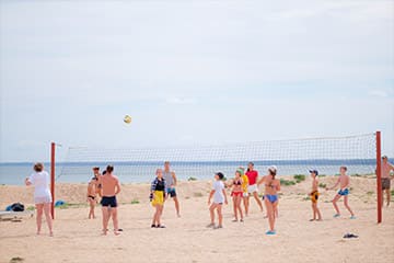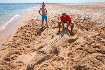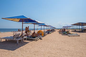 Просторный оборудованный пляж курортного комплекса находится в 350 м от корпусов. Южное побережье Азовкого моря. Пляж песчано-ракушечный. Протяженность - 1 км.