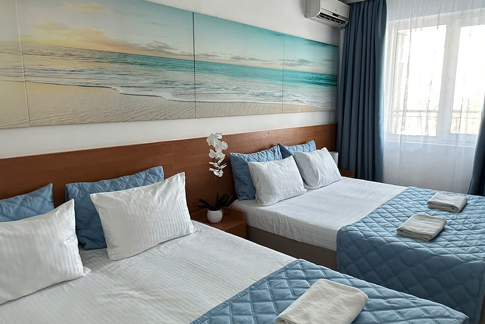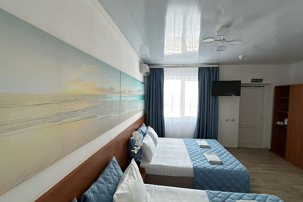 Номера данного типа располагаются в 3-х этажном корпусе на 2м и 3 этаже. К услугам отдыхающих эргономичные кровати с ортопедическими матрасами, сейф с кодовым замком, вместительный шкаф, плазменный телевизор и холодильник. Санузел с душевой.