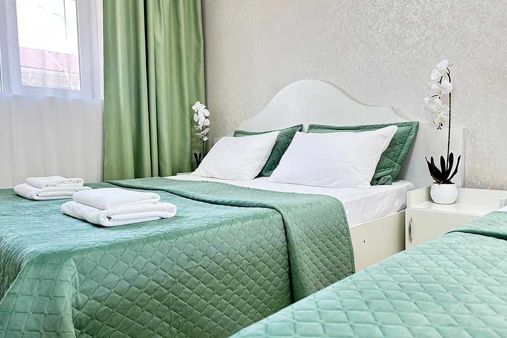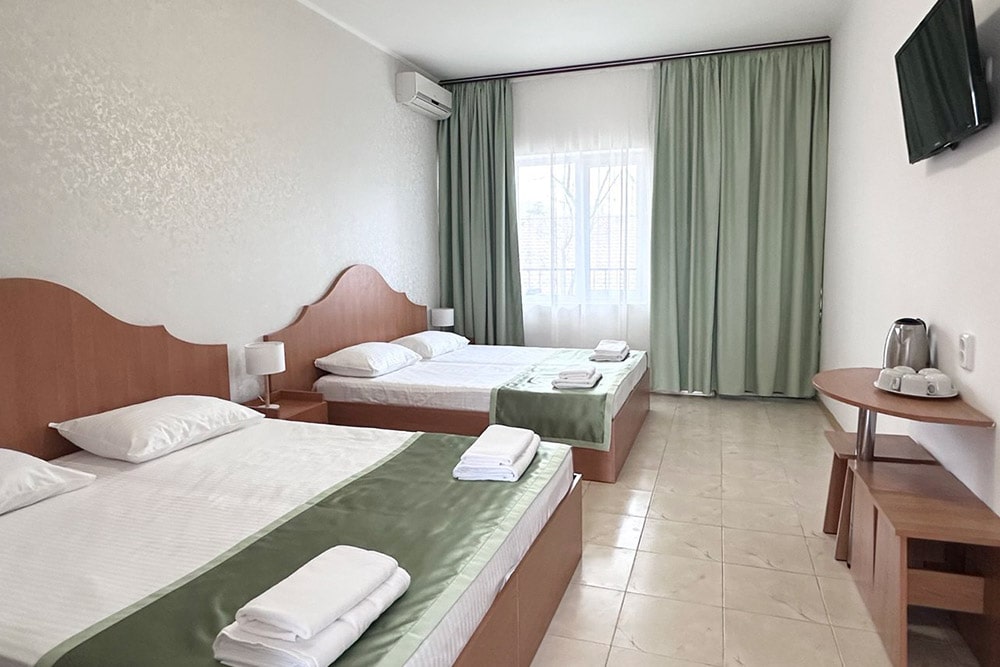 Обращаем внимание, что в номерах, рассчитанных на проживание более 2 человек - трех-, четырех- и пятиместных, соответственно, третье, четвертое, пятое места - дополнительные. При этом при расчете путевки 2 места считаются как основные, а на все остальные предоставляются скидки. Заселение в номер происходит из расчета количества человек по путевке - в 3-х, 4-х или 5-ти местные номера.