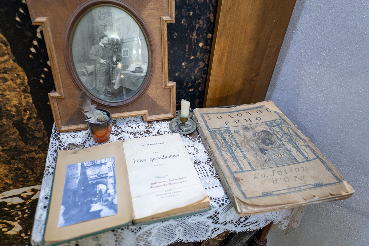 - В доме сохранилась мастерская Волошина, где можно увидеть его краски, кисти, палитры и другие инструменты, которыми он пользовался при создании своих акварелей.
